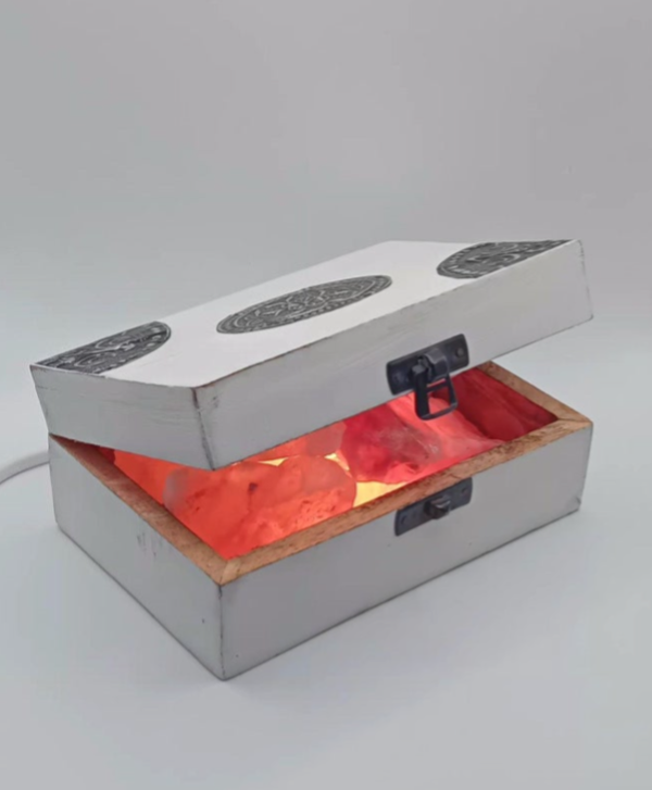 Forziere con decorazioni in metallo di colore bianco con all'interno i pezzi di sale rosa dell'Himalaya illuminati da una lampadina di 15 watt per tirare una luce soffusa e rilassante